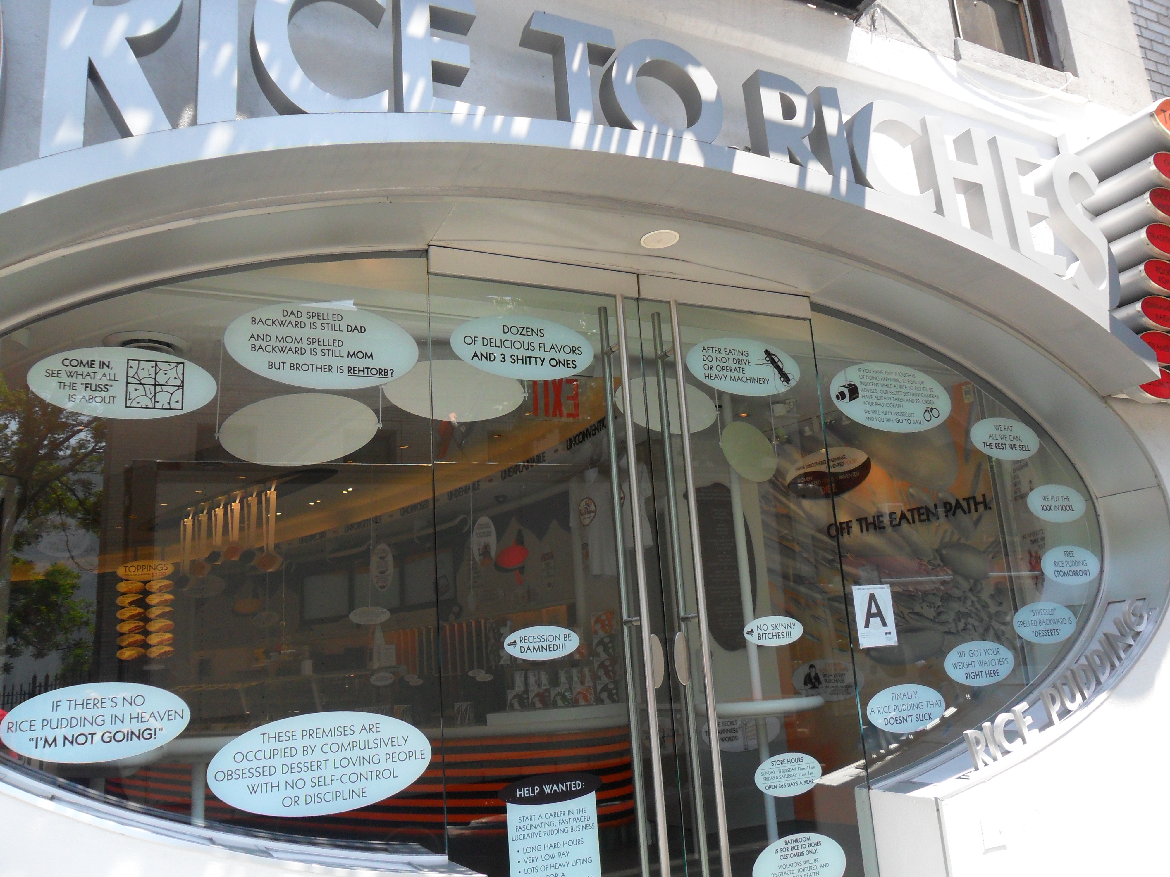 On Spring Street between Mott and Mulberry Streets we found Rice to Riches, a shop dedicated entirely to rice pudding. There were around 20 flavours to choose from with various toppings. Fraser’s only complaint of the place was that there was no facility to heat up the puddings, they all have to be eaten cold.